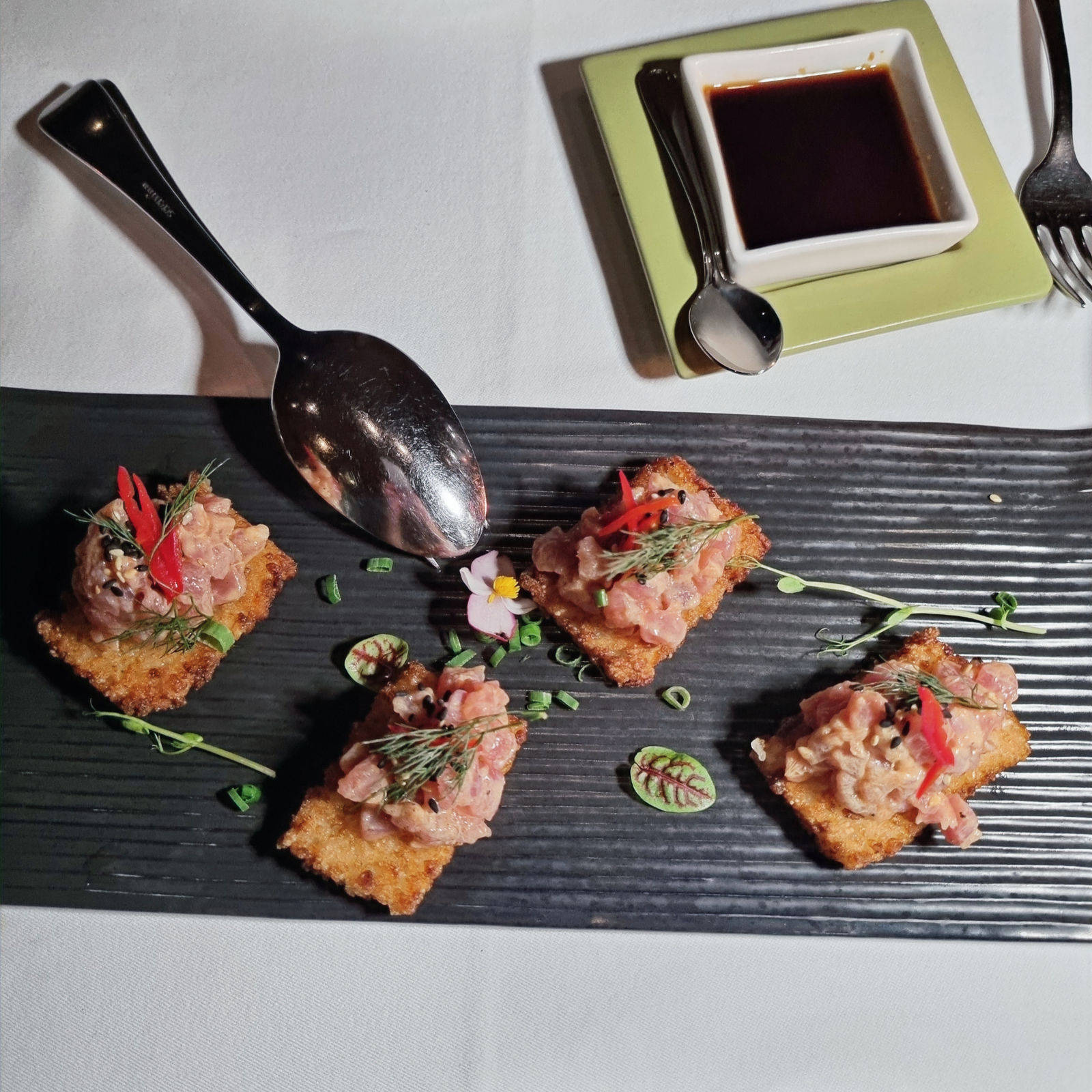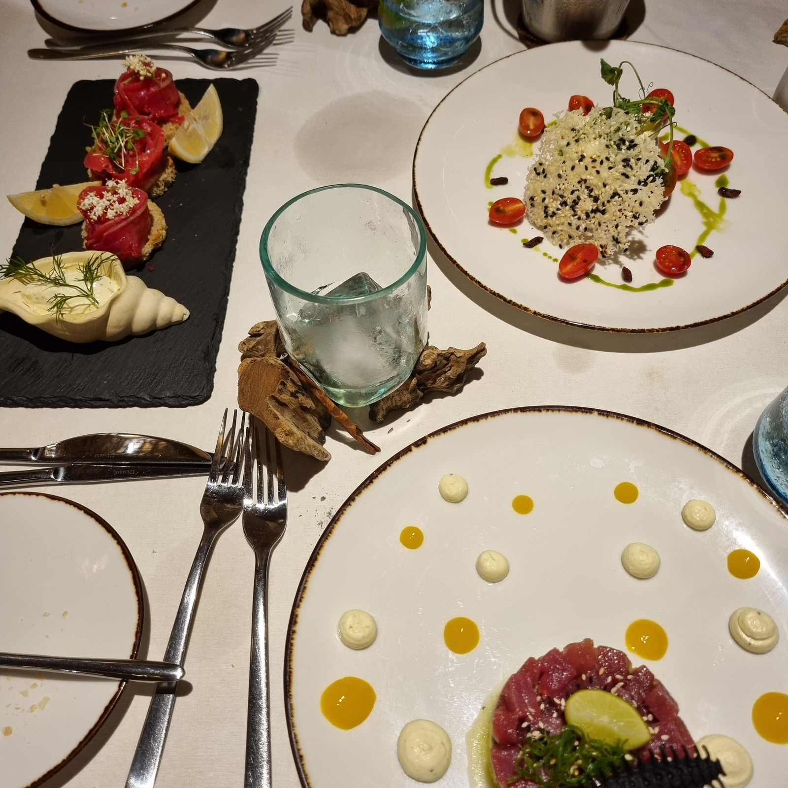 We also dined at Sardine, a beautiful restaurant with amazing food and a real party vibde. This open-air restaurant has a unique ambiance, blending Bali’s natural beauty with a touch of rustic chic. We started with crispy rice sushi with tuna, which was incredibly fresh, followed by a main of grilled seafood.